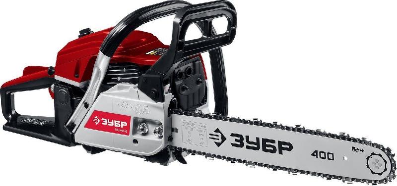 Идеальный вариант для пиления досок, бруса, стволов различных пород дерева на дачном участке. В отличие от электрической, бензиновая пила оснащена более мощным двигателем, безопасна в отношении поражения электрическим током, может работать в любую погоду и в любом месте. Функции легкого запуска, автоматической смазки цепи и эффективная антивибрационная защита делают пилу легкой в обращении и комфортной в работе. Двойной тормоз цепи, приводимый в действие при откидывании защитного щитка или при отпускании клавиши блокировки на рукоятке, а также встроенный цепеуловитель и металлический упор делают пилу безопасной в применении. Большая удельная мощность, высокое качество применяемых материалов и изготовления, обеспечивающие увеличенный ресурс, делают бензиновую пилу ЗУБР Вашим лучшим помощником. Обратите внимание, что рекомендуемая пильная гарнитура ЗУБР устанавливается только комплектом