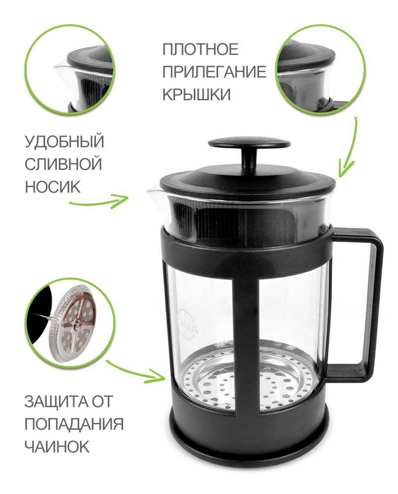 Френч-пресс ТИМА - это устройство для приготовления кофе или чая методом настаивания и отжима. Поршень френч-пресса оснащен специальной сеткой-фильтром, которая препятствует попаданию листьев чая и зёрен кофе в напиток. Френч-пресс идеально подходит для заваривания листового чая и зернового кофе, мелкого и среднего помола.