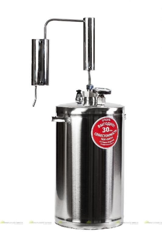 В комплект входят силиконовые шланги, термометр, спиртомер, сухопарник для слива «сивушных» масел. Самогонный аппарат изготовлен из пищевой нержавеющей стали. Объем перегонного куба – 20 л.