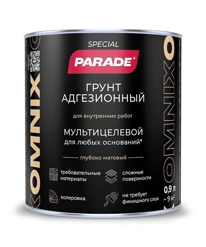 PARADE OMNIX – алкидная грунтовка широкого спектра применений, включая проблематичные поверхности, требующие повышенных адгезионных свойств. Рекомендована для таких сложных поверхностей, как стекло, кафель, ПВХ-пластик, полипропилен, оцинкованная сталь, алюминий. Также подходит для изделий из черного металла, бетона, дерева, ДВП, ДСП, МДФ и поверхностей, ранее окрашенных алкидной краской.