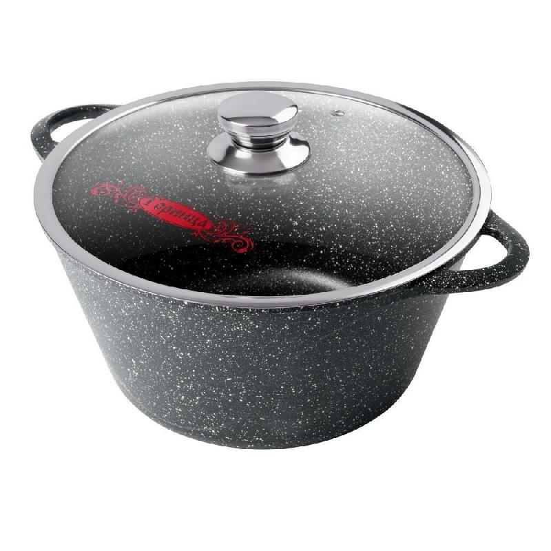 Литая алюминиевая кастрюля с антипригарным покрытием ТМ Горница подходит для газовых, электрических, стеклокерамических, индукционных плит. Электрическая духовка либо газовая также допускают использование кастрюли в процессе готовки. Идеальна для приготовления мяса, овощей, грибов, супов и т.д. «Гранит Induction». Посуда базовой коллекции «Гранит» с важной особенностью – наличием индукционного дна. Сочетание классического черного цвета с белым крапом подчеркивает такие качества посуды, как высокопрочность и долговечность, подобно настоящей породе граниту. Антипригарная кастрюля изготовлена из пищевого алюминия без канцерогенных веществ. Имеет толстые стенки и дно для обеспечения равномерного распределения тепла. Кастрюля металлическая имеет антипригарное покрытие на водной основе, которое создает защитный барьер между чистым алюминием и пищевыми продуктами. Кастрюли с антипригарным покрытием легко мыть благодаря их гладкой поверхности.