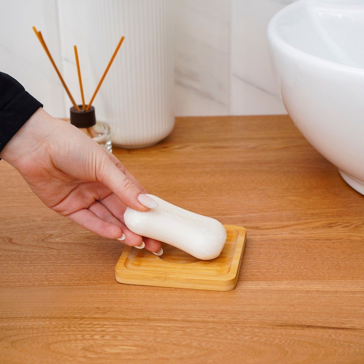 Мыльница из бамбука станет прекрасным дополнением ванной комнаты, а её дизайн впишется в любой интерьер. Изделие покрыто лаком, и поэтому легко отчищается от загрязнений и не впитывает запахи. А для того, чтобы вода не портила покрытие мыльницы, предусмотрены отверстия. Благодаря этому мыло не будет размокать.
