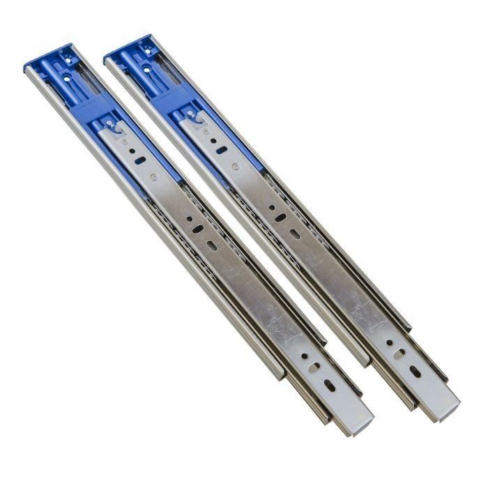 Шариковые направляющие полного выдвижения с амортизацией. Направляющие обеспечивают простое и комфортное открывание и закрывание ящиков. Модель изготовлена из стали, а значит надежна и долговечна. Оцинкованное покрытие защищает металл от влияния ржавчины и коррозии. Направляющие выдерживают нагрузку до 35 кг, что позволяет хранить в ящике тяжелые предметы.