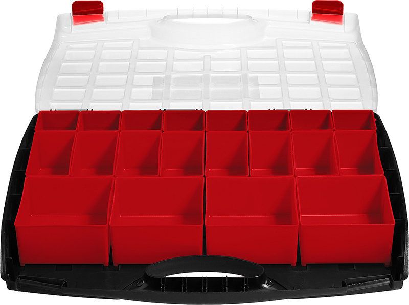 Сохранность инструментов и крепежных изделий обеспечат профессиональные пластиковые ящики для инструментов и органайзеры «ЗУБР». В зависимости от размера в них можно хранить и транспортировать ручной инструмент или профессиональные приборы и оснастку. Специальные отсеки упрощают доступ к мелким деталям и расходным материалам.