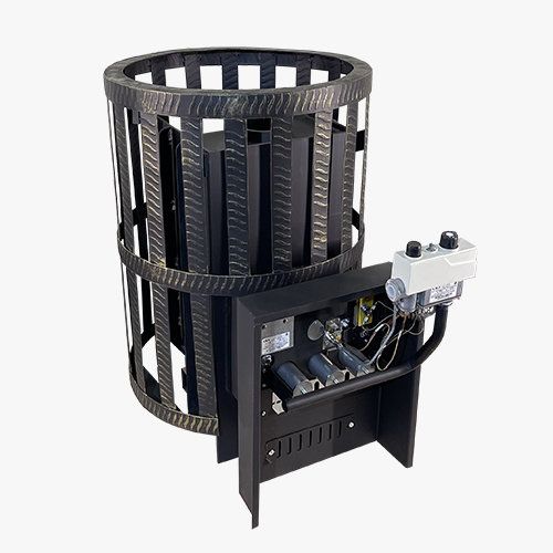 Печь рассчитана на объем парной до 20 м3 . Большая масса камней (140 кг) вокруг топки быстро нагревается и аккумулирует тепло в камне. Для нагрева воды опционально устанавливается контур теплообменник в камеру сгорания!!!