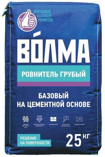 «ВОЛМА-Ровнитель грубый» - сухая многокомпонентная смесь, изготовлена на основе высококачественного цемента, извести с фракционированными натуральными наполнителями, модифицированная полимерными и химическими добавками, усиленная волокном. Обладает низкой усадкой, высокой прочностью и адгезией с основанием. Пластичная, морозостойкая, легко наносится и разравнивается, шлифуется. Раствор быстро схватывается и набирает прочность, что позволяет ускорить рабочий процесс.