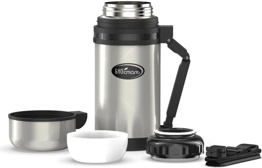 Универсальный термос с боковой ручкой и съёмным ремешком для переноски.