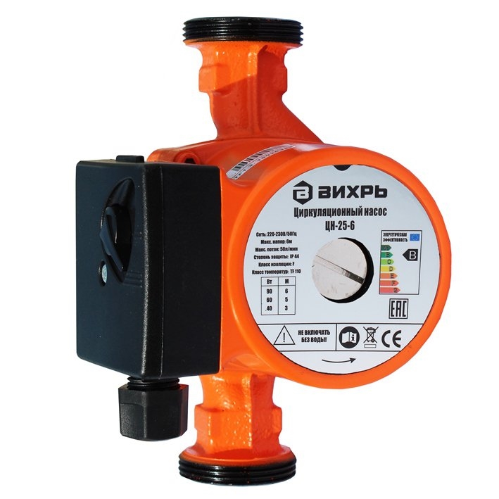 Циркуляционный насос Вихрь ЦН-25-6 ПРОФ станет хорошим выбором для системы отопления. Отвечает за циркуляцию воды, но также может применяться и для теплоносителя, так как способен выдерживать до 110 °C, что соответствует классу температур TF 110. Предусмотрено три режима работы мощностью 40/60/90 Вт, при максимальном режиме мощности напор воды может достигать 6 м.