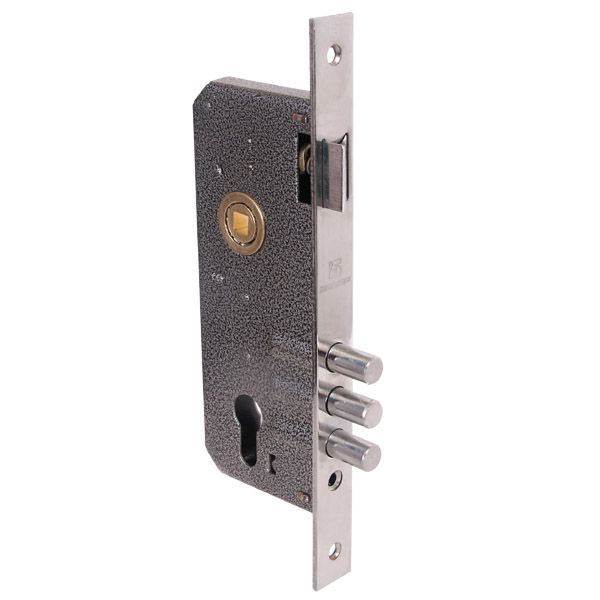 Три цилиндрических стальных ригеля, диаметр 12мм. Вылет ригелей 20мм. Удаление ключевого отверстия 45мм. Межосевое расстояние 85мм. Цвет торцевой планки - хром, ширина 22мм.