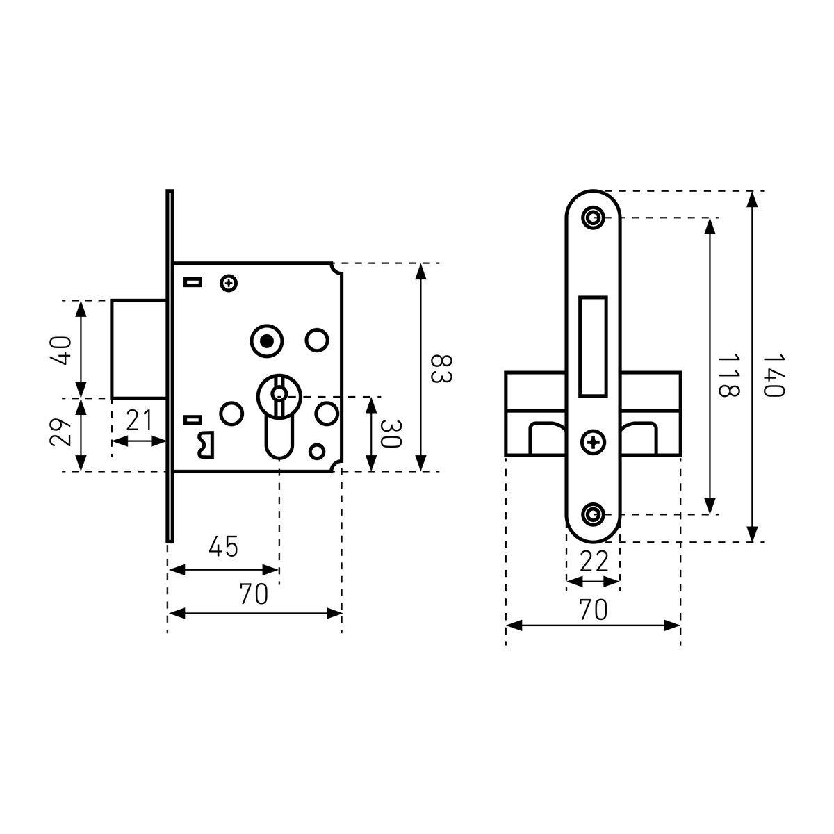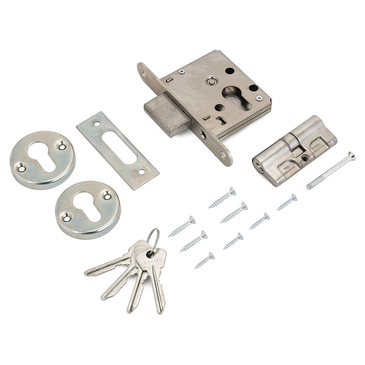 Замок врезной цилиндровый. Предназначен для установки в деревянные двери до 50мм. Стальной оцинкованный корпус. Прямоугольный ригель, вылет 22мм. Удаление ключевого отверстия 45мм. Габаритный размер 80 х70 х13 мм. Комплектуется цилиндровым механизмом 70мм с 4 ключами, запорной планкой, комплектом накладок и комплектом для крепежа.