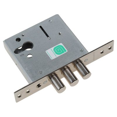 Три цилиндрических ригеля, диаметром 15,8мм, вылет 26мм. Удаление ключевого отверстия 65мм. Стальная торцевая планка, покрытие - никель, ширина планки 30мм.