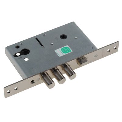 Замок врезной цилиндровый с защелкой, без механизма секрета. Предназначен для металлических дверей. Замок имеет засов из трех цилиндрических ригелей из стали диаметром 15,8мм, с максимальным вылетом 26мм, и защелку диаметром 19,8мм. Удаление ключевого отверстия 65мм. Межосевое расстояние 85мм. Толщина полотна двери: 40-75 мм. Количество оборотов ключа – 2. Габариты замка - 155х97,5х22 мм. Переворот защелки выполняется без разбора замка.