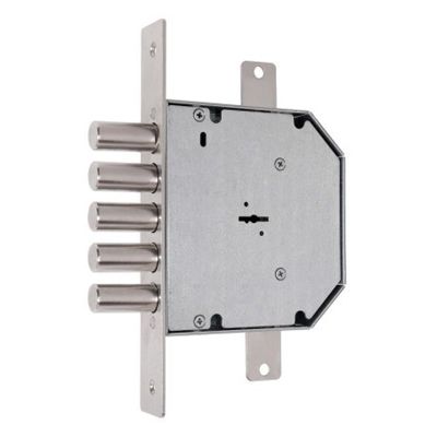 Замок имеет засов из пяти цилиндрических ригелей диаметром 18 мм, с максимальным вылетом 40 мм, и тяги с вылетом 20 мм.