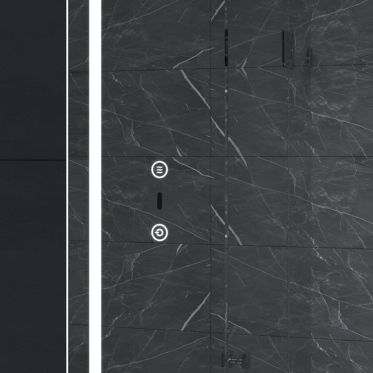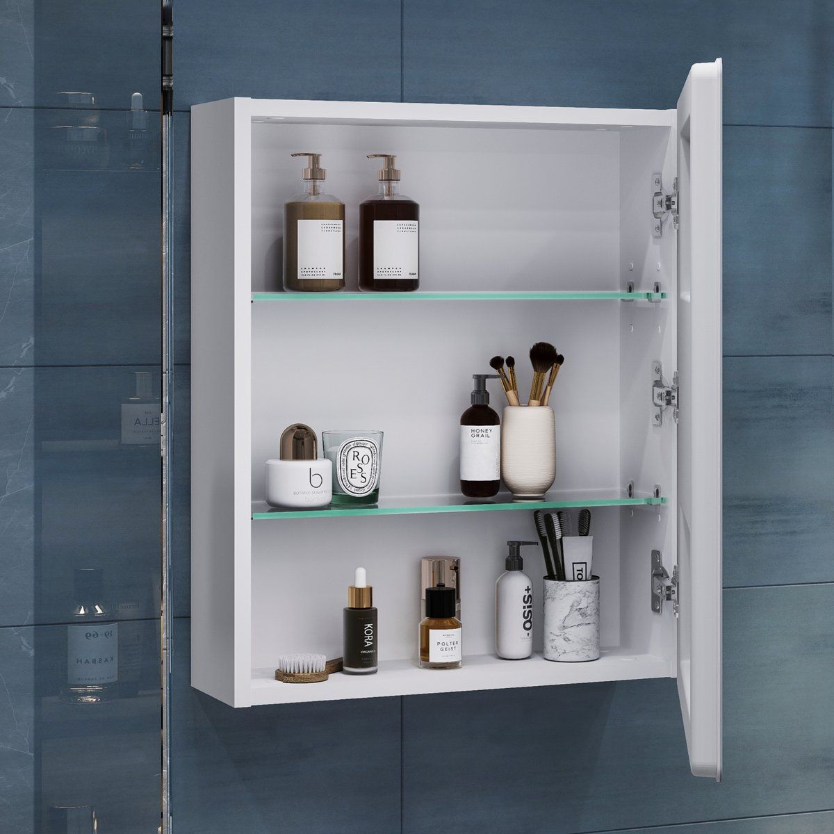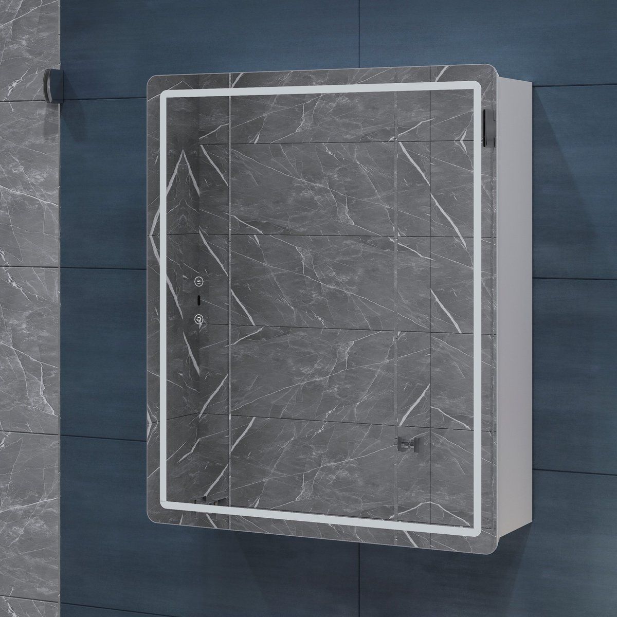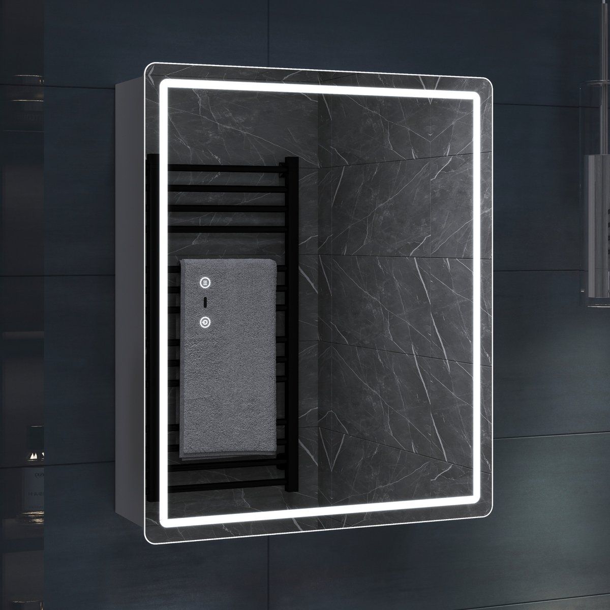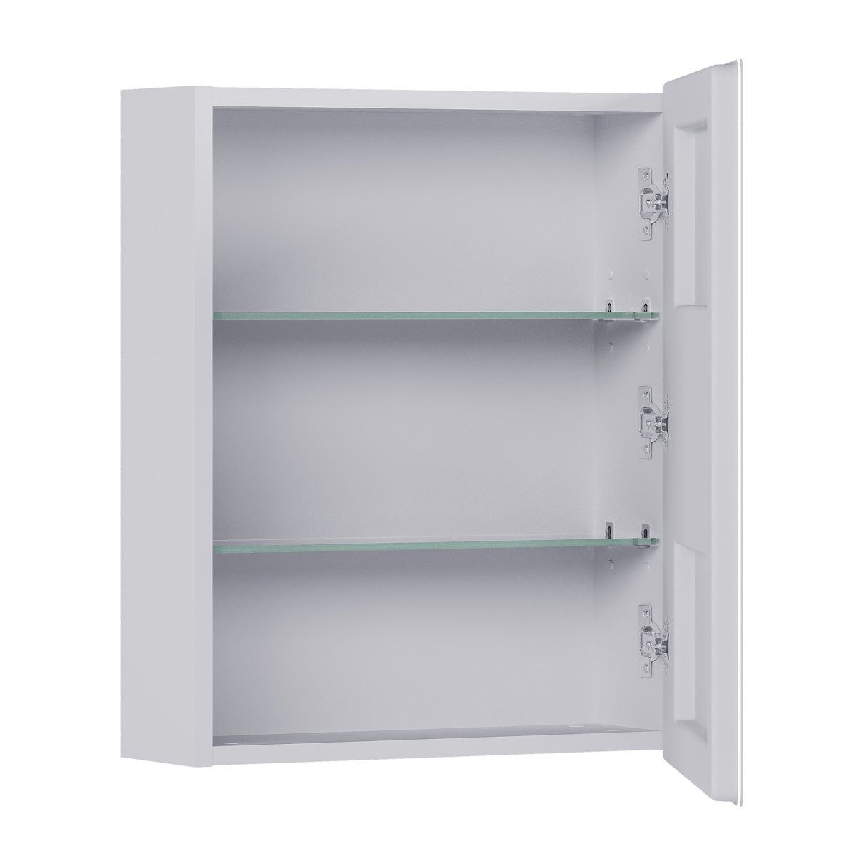 Оснащение: 1 дверца, петли с механизмом доводчика, 2 стеклянных полки, светодиодная подсветка по периметру, датчик присутствия, сенсорное включение, функция антизапотевания, диммер