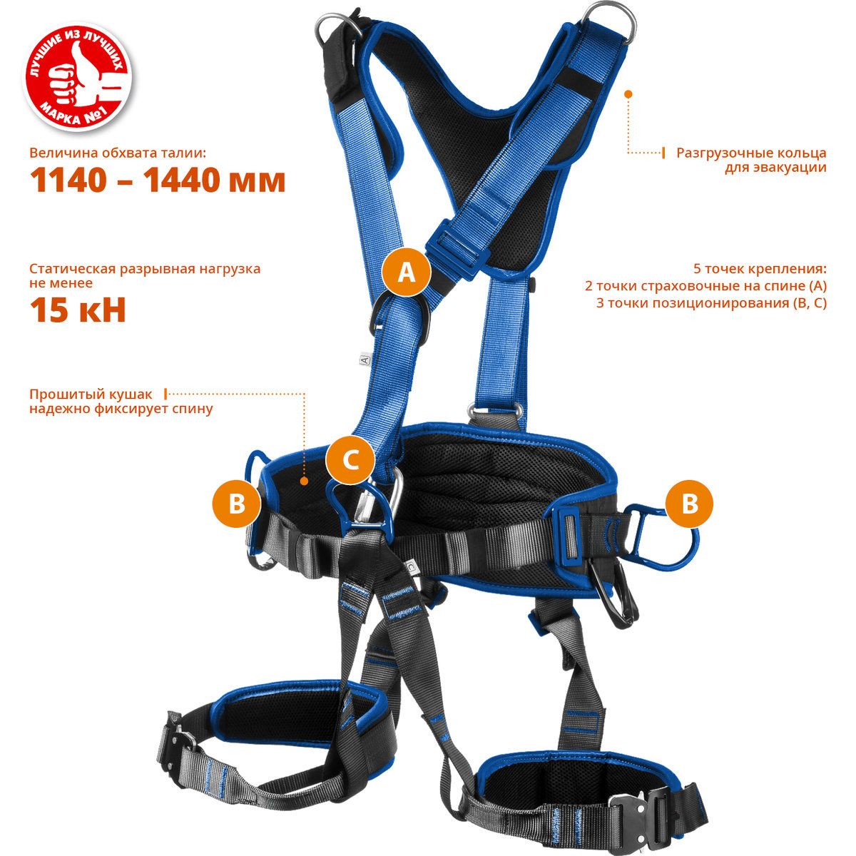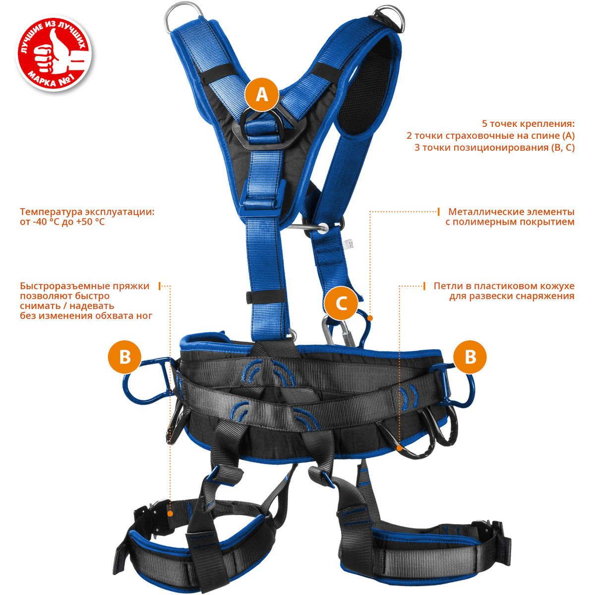 Пять элементов крепления (1 на спине, 1 на груди, 1 брюшная, 2 боковые) позволяют использовать привязь как страховочную, удерживающую, привязь для позиционирования и спасательных работ.